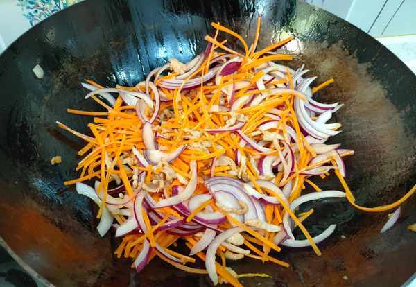 7、接著下入切好的洋蔥絲和胡蘿卜絲,大火翻炒,把洋蔥的香味炒出來。