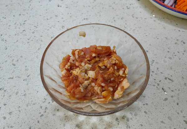 1、首先我們準備一小塊前腿肉,切成細絲,加入少許的鹽、白胡椒粉、料酒、醬油醃制5分鐘。