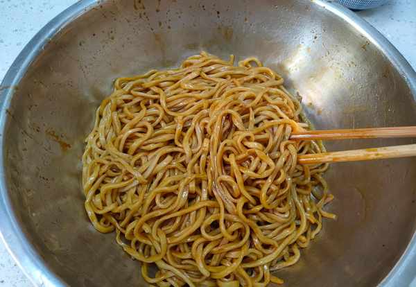 4、面條不需要煮太熟,大概七八分熟就可以,用手一掐,裡面還會有一點白芯,撈出來以後馬上用涼水沖洗,完全涼透以後把水分控幹,這個時候再加入適量的食用油和老抽,翻拌一下,讓每一根面條都裹上醬油色,同時還能防止面條之間粘連。