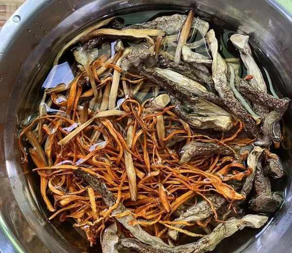 2.幹的蟲草花跟鹿茸菇,還有黃花菜要提前泡發,如果時間比較著急,我們可以直接用溫水浸泡。泡發後的食材再用清水洗幹凈,洗凈後放在一旁;