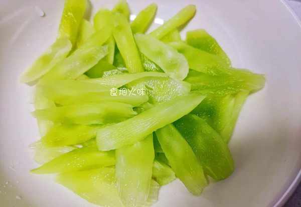 2.萵筍取出放在盆中,準備一個幹凈的削皮刀,將萵筍的表皮去掉,去皮後的萵筍洗凈,用刀切成細片,切好的萵筍放在一旁備用;