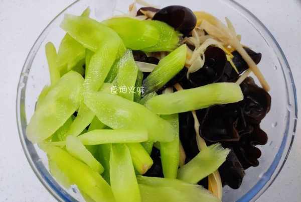 4.焯水後的黃花菜跟木耳撈出放在冷水中,過涼一下,然後倒入盆中,萵筍處理好後也倒入盆中,往裡面加入適量的食鹽,雞精,白糖,醬油,香油,還有蒜泥。