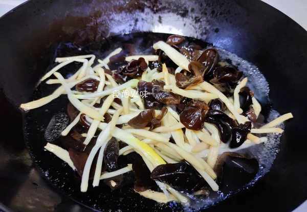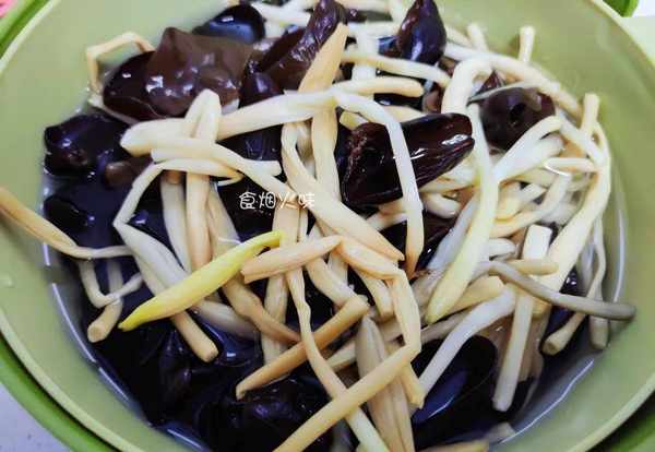 1.黃花菜跟木耳放在溫水中浸泡,泡發後的食材撈出再用清水沖洗幹凈,洗凈後的食材放在一旁備用;