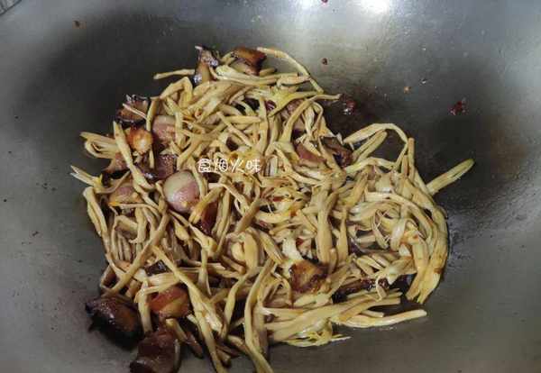 2.臘肉放入清水中洗凈,洗凈後切成細片,切好放在盆中備用。鍋中倒入臘肉片,用小火將臘肉煸炒出裡面多餘的油脂。鍋中的臘肉炒至微微卷起來,放入洗凈後的黃花菜,用鏟子將它們翻炒均勻;