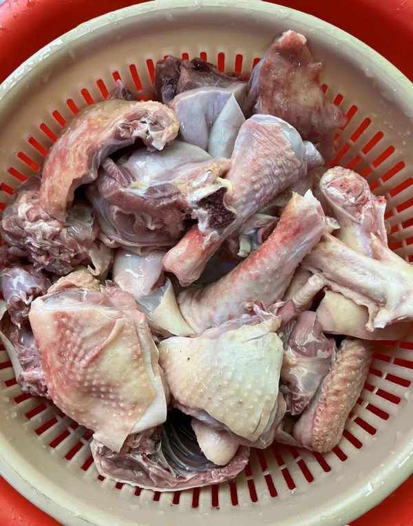 1.這一隻老雞是自傢養的,然後將它放處理幹凈之後,把雞的內臟處理幹凈。處理好後再多沖洗幾遍,洗幹凈之後的雞肉放在墊板上用刀將它剁成塊,剁好的雞肉塊放在一旁備用;