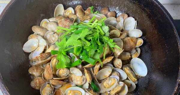 3、把煮鍋花蛤的鍋刷洗幹凈,開火把鍋中倒入適量的食用油,鍋裡油熱以後放入蔥薑、蒜炒一下,再把瀝水後的花蛤倒入,大火翻炒一下。接著放入2勺蠔油增加底部,翻拌均勻後把煮花蛤的湯汁倒進去,湯汁非常的濃鬱有營養,大火翻炒30秒,最後放入香菜段和青椒段炒至斷生後,關火盛出來就可以。