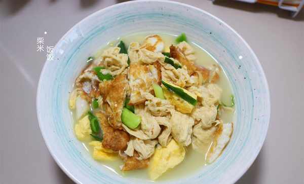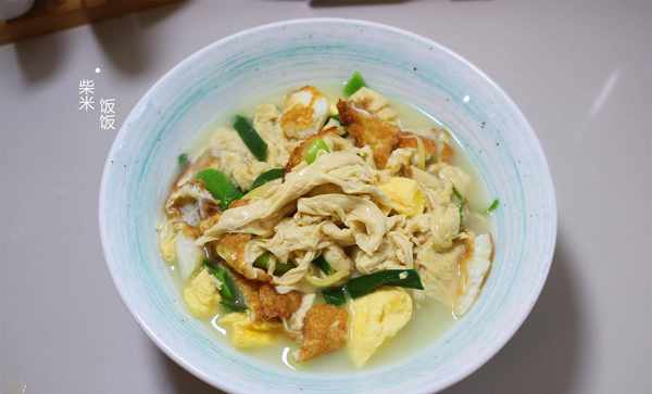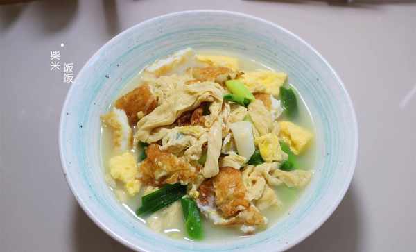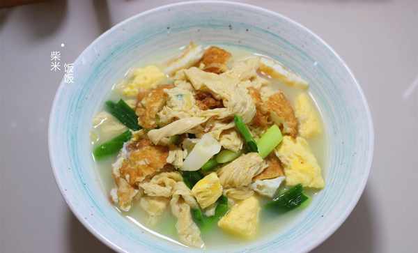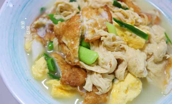 【食材】雞蛋、腐竹、青蒜苗、鹽、胡椒粉、雞精、薑