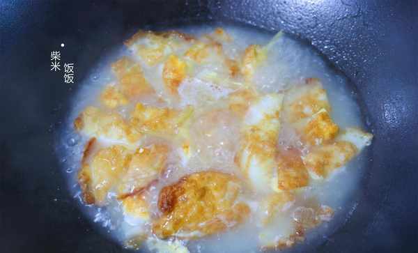 4,鍋裡留少許底油,將切好的雞蛋倒回鍋裡,加入半碗開水,再加一些薑絲去腥增香。大火煮2~3分鐘,將湯煮白。