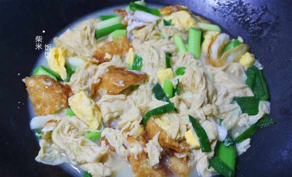1,我這裡用的是鮮腐竹,下入鍋中,大火稍微煮一下就可以,不需要久煮。如果是幹腐竹,需要提前至少四個小時用溫水泡發瞭。燒的時候可以和荷包蛋一起下鍋,大火煮2~3分鐘使其入味。最後放入蒜苗,接著調味就可以出鍋瞭。