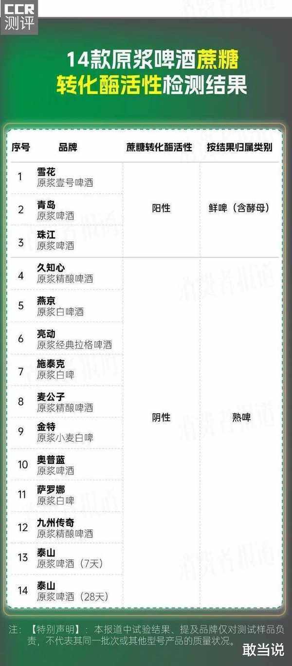 3、進一步檢測發現,長保質期的原漿啤酒有“貓膩”。10款保質期超過7天的原漿啤酒和泰山原漿啤酒(7天)的蔗糖轉化酶活性為陰性,說明這11款啤酒本質上是經過加熱殺菌處理的“熟啤”,並非消費者所認為的鮮活“原漿”。