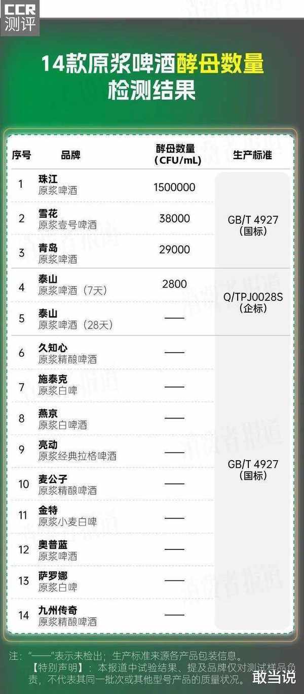 然而,泰山原漿啤酒(28天)卻並未檢出酵母,如此看來,這款原漿啤酒屬於不達標產品,同時,也和其在廣告中宣稱的“保留酵母活性”不符。