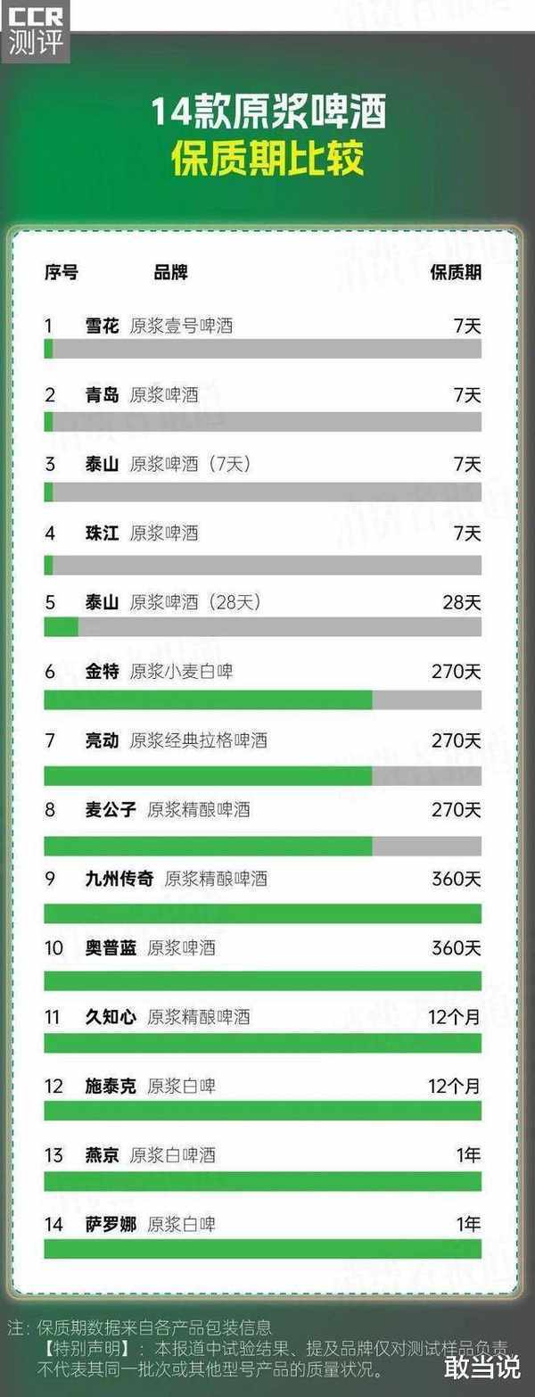 2、有10款保質期在28天~12個月之間,隻有泰山原漿啤酒(7天)、青島原漿啤酒、珠江原漿啤酒和雪花原漿壹號啤酒等4款為7天。