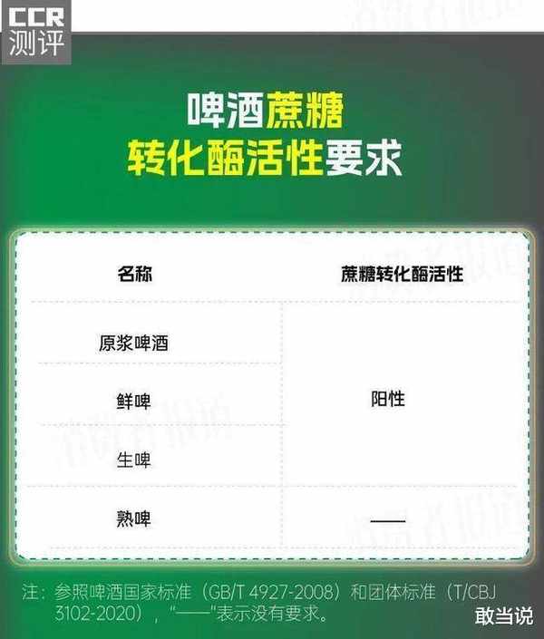 啤酒國傢標準(GB/T 4927-2008)規定,未經加熱殺菌的鮮啤和生啤的蔗糖轉化酶活性必須呈陽性,如果呈陰性,說明啤酒是熟啤。