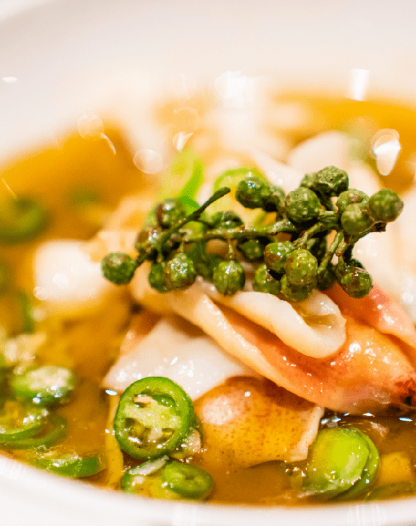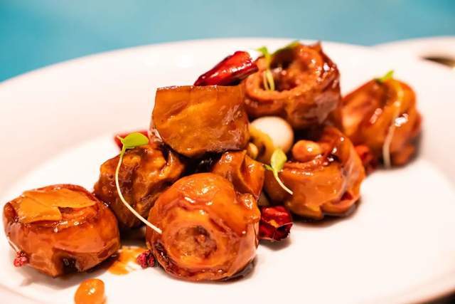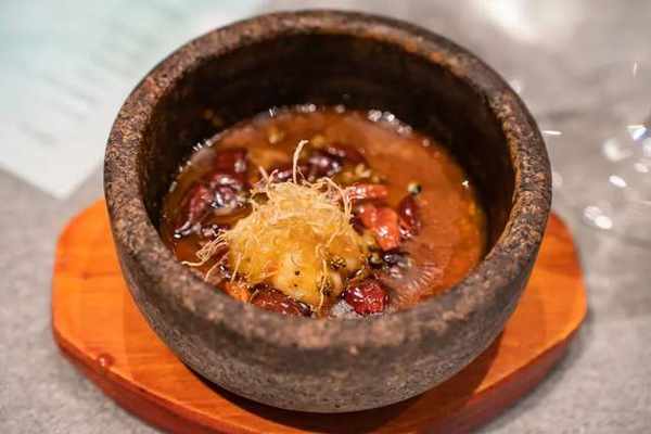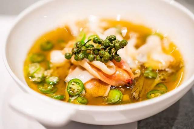 由不同花椒制成的椒香六巧碟,呈現瞭一場花椒的狂歡;用貢椒鹵汁油鹵過的鮑魚,透著獨特的熟甜香味,祛膩增香;泡椒鴨舌凍成為瞭青花椒的舞臺,鮮麻迷人。光是前菜就讓人吃得意猶未盡。