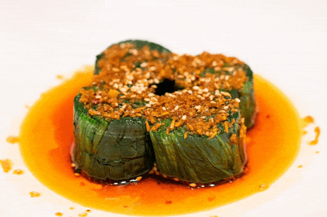 覆著厚厚一層辣椒的熗鍋鱖魚,演繹著川菜中最被人熟悉的一面——麻辣味型。氣勢逼人、類似江湖菜的做法讓人錯以為它大麻大辣,口感極其刺激,嘗過後才知道這道菜根本上是將辣椒的香發揮到淋漓盡致。