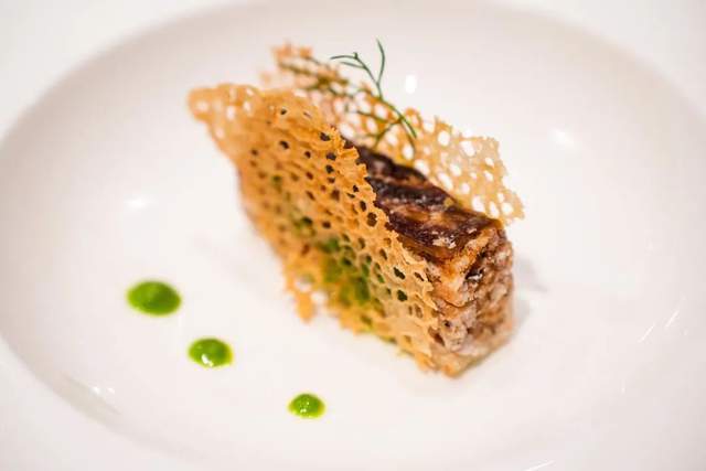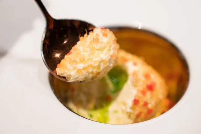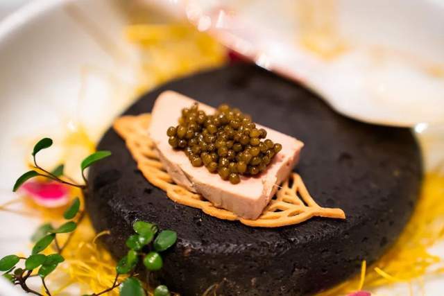 魚子醬煙熏鵝肝,鵝肝豐腴,點睛之筆在於它是提前用青花椒調和的清酒浸泡而成,和魚子醬碰撞在一起,兩種鮮味交織,在齒縫間跳舞。