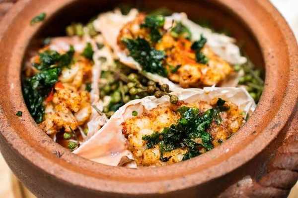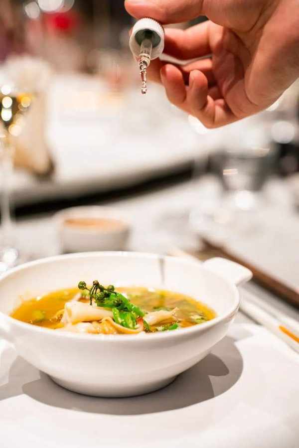 青椒汁蚌仔,蚌仔水煮後淋上點睛之筆——由銀鍋貢椒風味實驗室萃取的青花椒精油,蚌仔的鮮味中透著青花椒獨有的檸檬香氣,清爽甘香,麻而不燥。