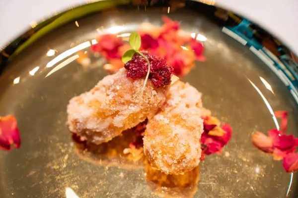 食到末尾處,總需要一道甜蜜收尾。以雞蛋、面粉和玫瑰花制成的面點小吃,玫瑰鍋炸,表面泛著晶瑩的光澤,瑰香濃鬱,甜而不膩。