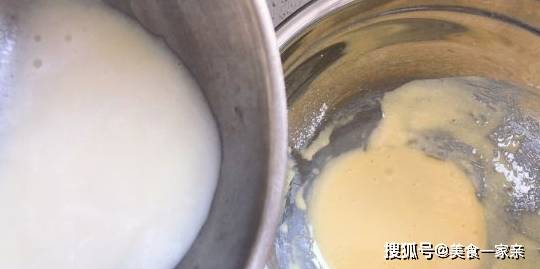 15.煮好的豆漿分多次倒入蛋黃糊中,邊倒邊用電動打蛋器低速攪打均勻,以免燙成蛋花湯。