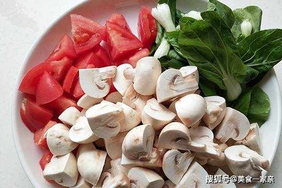 1、將口蘑放入水中清洗幹凈,然後切丁備用,西紅柿洗凈切塊,青菜清洗幹凈備用。