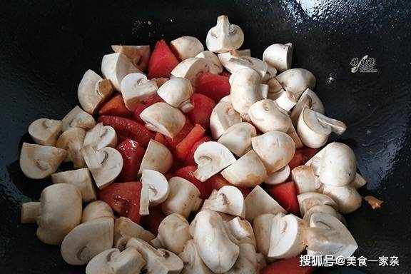 2、鍋中放入一勺豬油化開,然後把西紅柿倒進去翻炒兩下後,再倒入口蘑。