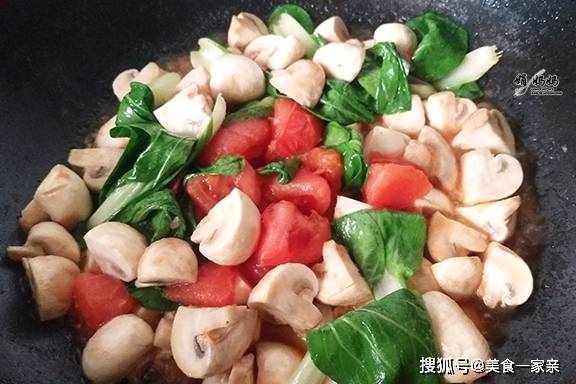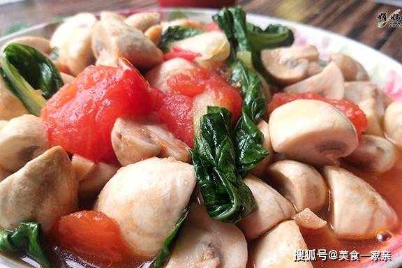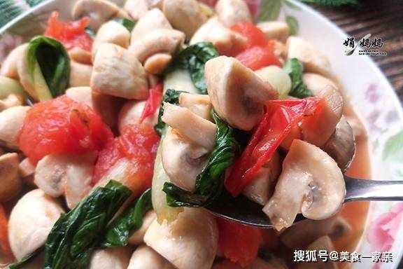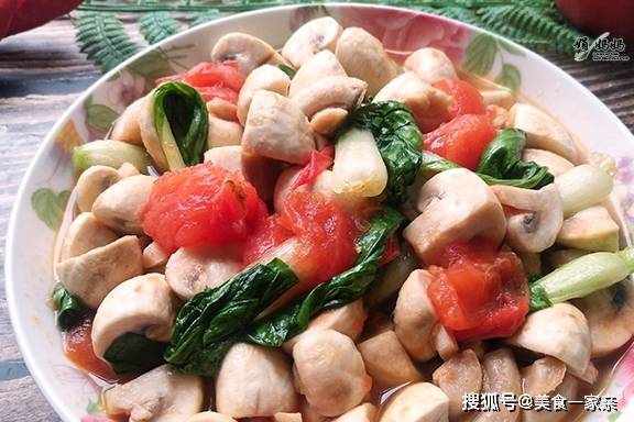 這道菜是由口蘑、西紅柿和青菜做的,