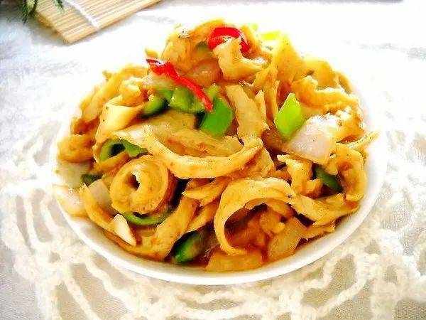 1 牛百葉切絲,放鹽,料酒研制一會。這樣可以防止炒牛百葉的時候快速縮掉