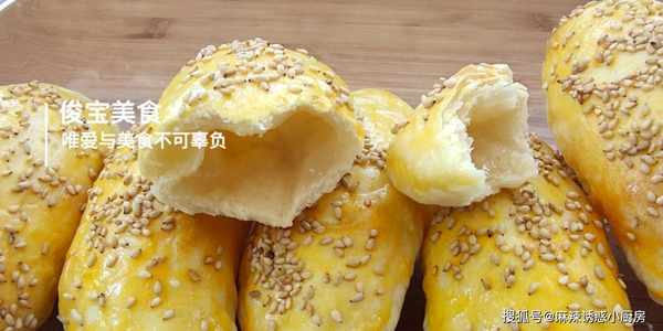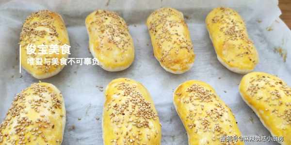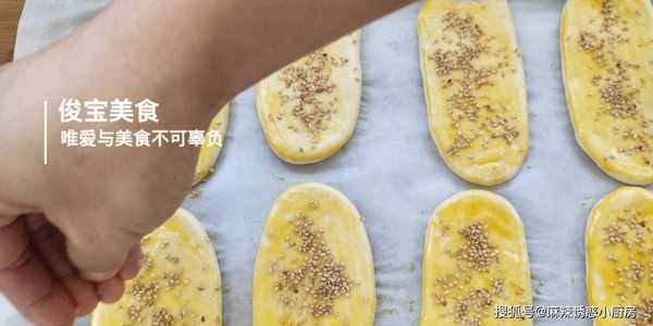 再將搟好的生坯擺入烤盤。上面刷上一層蛋黃液,既能增香又能增加顏值。最後撒上一層芝麻。進烤箱上下管180度,烤25分鐘左右。烤至酥脆即可。