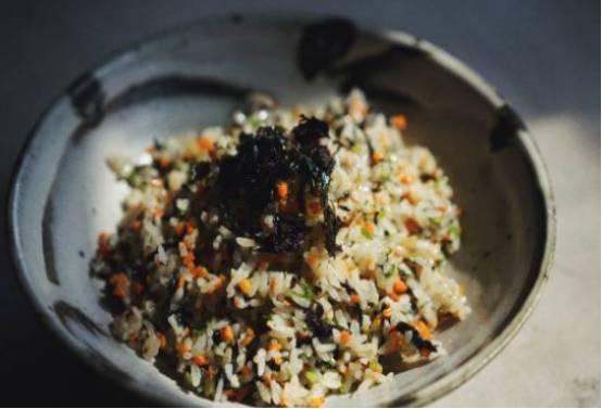 鍋中燒油,把剪成小塊的紫菜放裡面,小火炒幾秒,再把胡蘿卜和芹菜放裡面炒熟,把煮好的飯放裡面炒散,加鹽翻炒均勻,最後撒上一點蔥花即可。