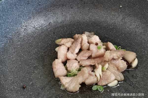 2、五花肉洗幹凈,切成片後,放入炒鍋中,中火無油煎五花肉大約1分鐘到1分半鐘,出香味出油後出鍋備用。之後鍋中加入適量的食用油,大火燒熱,放入白糖炒化開,把五花肉片倒入鍋中,翻炒半分鐘,加入蔥薑蒜八角和花椒,翻炒豬肉1分鐘。