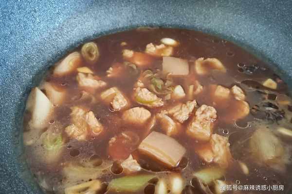 第三步,時間要夠,豬肉炒好之後,加入開水大火煮開,轉小火燉夠50分鐘,這樣湯汁濃鬱的口感才能出來。時間短,燉不出豬肉的香味,就像紅燒肉要燉2個小時才能入口即化一樣的道理。