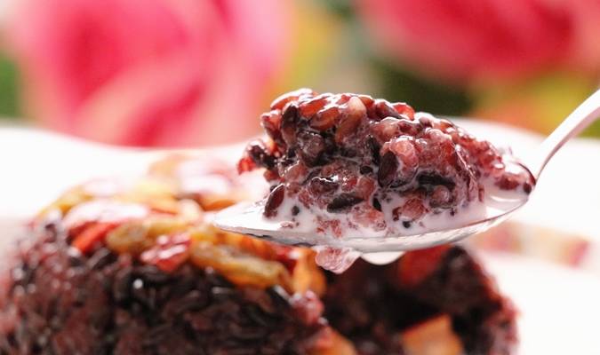 三人份所需食材有黑糯米150克、白糯米50克、堅果少許、紅棗10顆、葡萄幹1小把,枸杞1小把、牛奶適量。