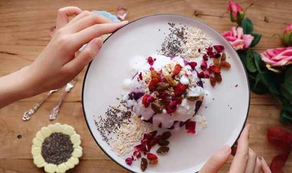 將紫薯去皮,清洗幹凈後切成薄片,入鍋蒸熟。將蒸熟的紫薯碾成泥,準備一個碗,碗中鋪保鮮膜,將紫薯泥裝入碗內,壓實後倒扣在盤中。上面這些步驟我們都可以在前一天的晚上來做。轉天一早起來,把紫薯倒扣在盤子上,表面淋上酸奶,撒上麥片和奇亞籽和自己喜歡的果幹。