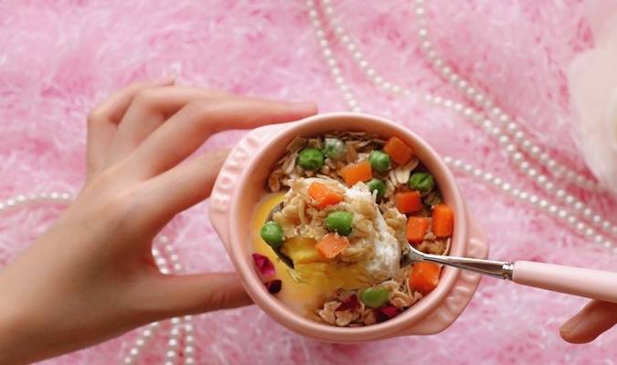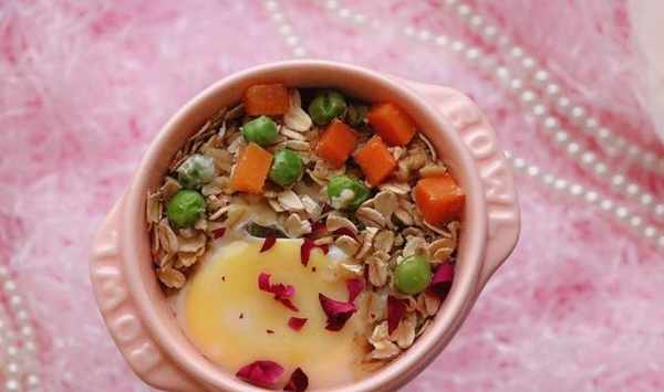 胡蘿卜清洗幹凈後去皮,切成小塊兒備用。在準備蒸蛋的容器中倒入生抽、橄欖油和適量的鹽,攪動均勻。在調料上均勻地撒上胡蘿卜和豌豆,再撒入燕麥片。磕入雞蛋,容器上蓋上可加熱的保鮮膜,保鮮膜上用牙簽紮上一些小孔就可以入鍋蒸制瞭。上汽後大火蒸制10分鐘。