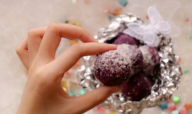 紫薯去皮後清洗幹凈,切成片兒入鍋蒸制,上汽15分鐘左右就好瞭。將麥片、蜂蜜和花生醬混合在一起。再與紫薯泥混合,攪拌均勻。團制成每個大約為30克左右的紫薯燕麥球,還可以點綴些椰絲。