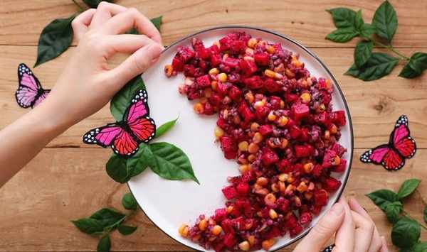 蒸制雜米飯,這項工作在前一天的晚上抽出一些時間來完成。早晨準備早餐時,我們先給火龍果去皮,果肉切成小塊兒。在鍋中倒入少許的橄欖油,油量不要過多,將雜米飯、玉米粒一起倒入鍋中,中小火將其炒散,撒入少許鹽調味。雜米飯炒熱就能關火,加入火龍果果肉,翻炒均勻後撒少許堅果碎,3分鐘出鍋盛盤。