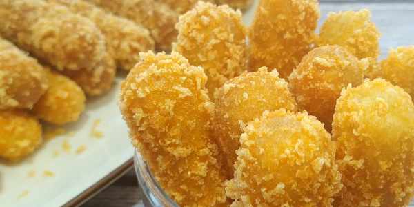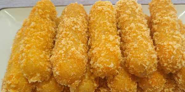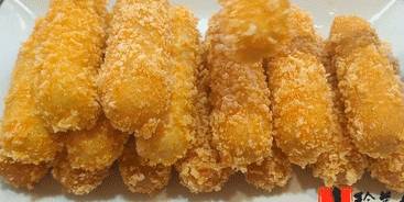 4.取一個小長條,全身都沾上純牛奶,在裹上面包糠,全部做好以後擺入平底盤中,油溫五成熱下鍋炸,開中小火慢炸,油溫不要太高很容易開裂,用筷子不停地翻動,炸至金黃飄起來就可以撈出來控油