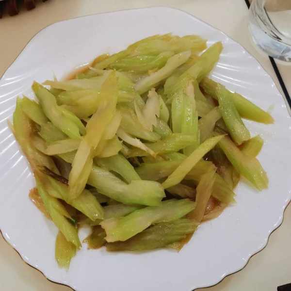 清炒芹菜做法:1,芹菜摘下葉子,洗淨斜切成片。2,鍋裏放入花生油燒熱,放入薑絲葱末炒香。3,倒入芹菜大火煸炒,加入鹽盒半勺生抽調味。4,炒勻出鍋裝盤即成。