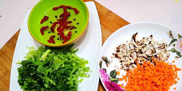 第二:泡小米的空檔,我們把洗凈的油麥菜切碎,香菇兩個洗凈去蒂後切丁,胡蘿卜小半根也切成小丁,一小把枸杞用溫水泡軟備用。