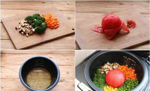 所需食材:西紅柿、藜麥、大米、香菇、西蘭花、胡蘿卜、豌豆和熟玉米粒。調料:生抽、玉米油和鹽。