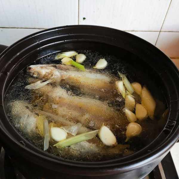 第五步:把煎好的梭魚放到砂鍋裏,倒入開水,放入葱,薑,大蒜,大火燒開,改成中火繼續燉。