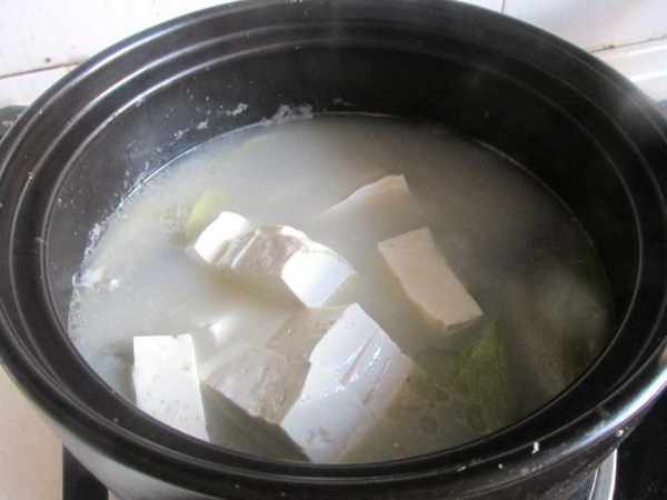 第六步:燉到魚湯發白,把內脂豆腐切成塊放入,加入鹽調味,繼續燉5分鐘,就可以關火了。