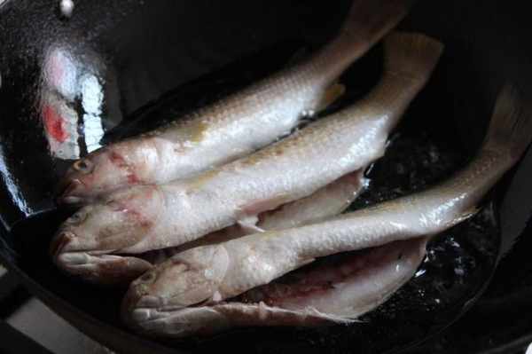 第四步:熱鍋凉油,把梭魚放入到鍋裏煎至兩面發黃,這一步是魚湯白如牛奶關鍵的一步。