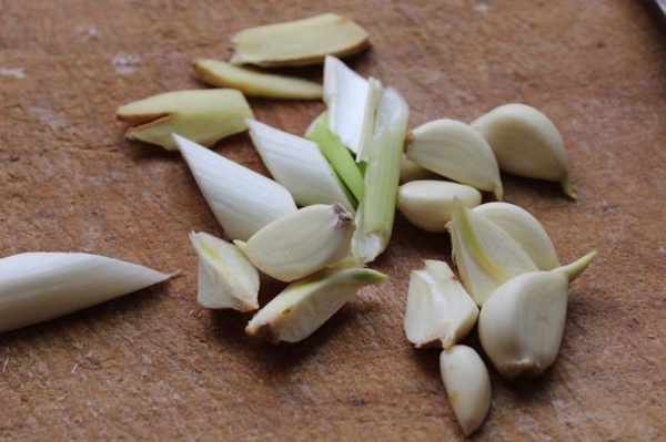 第三步:把葱,薑改刀,大蒜去皮備用。