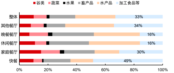 1998年之後,日本經濟開始往下走,餐飲規模回落,B端預制菜出現瞭量價齊落的現象,但最後依然實現瞭比較高的滲透率。從下圖可以看到,最右邊淺藍色部分為加工食品,也就是預制菜,它在整個餐飲業態中的采購成本占比,平均下來大概是33%。