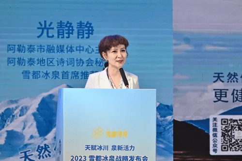 雪都冰泉首席推薦官光靜靜生動形象的介紹瞭雪都阿勒泰、新疆雪都冰川水有限公司的發展歷程及雪都冰泉的低氘特性。