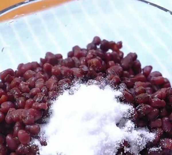 第5步、紅豆稍微控幹水分,然後加入白砂糖,搗成紅豆泥。