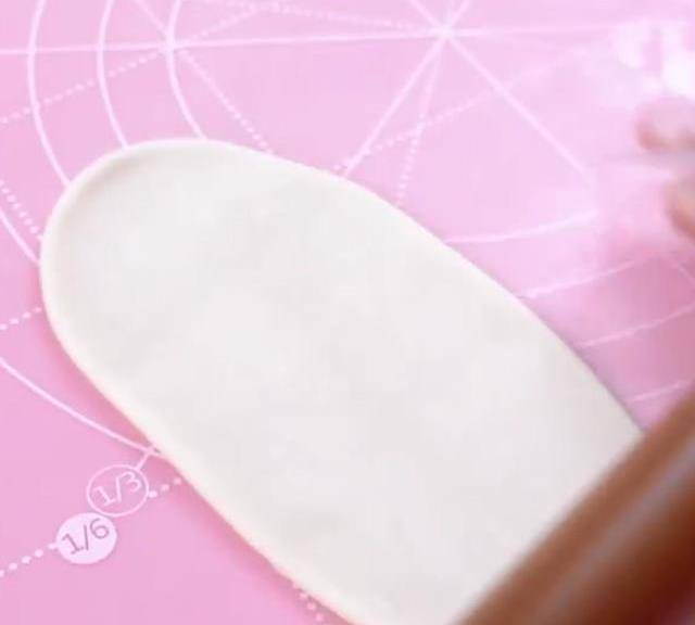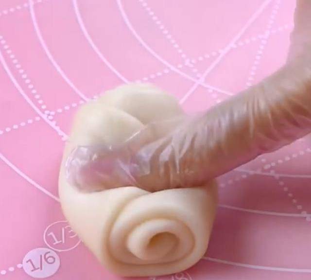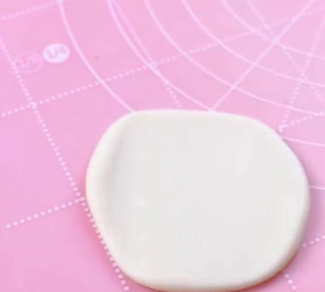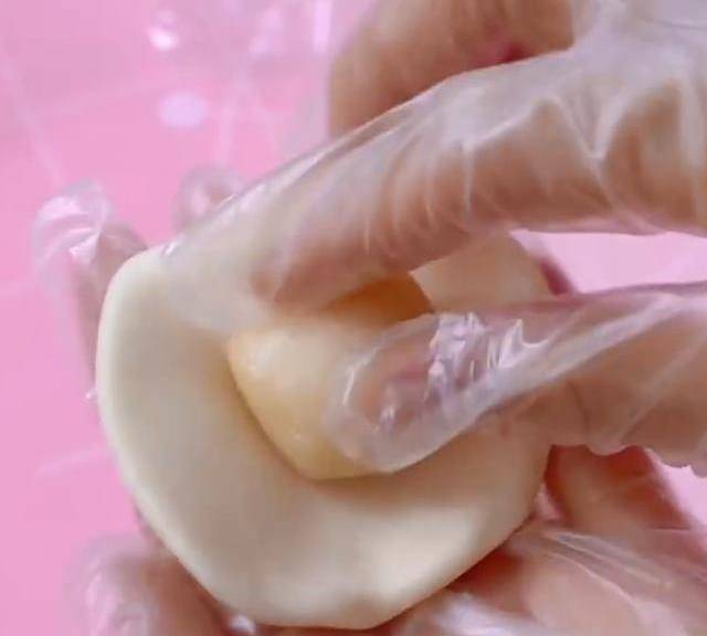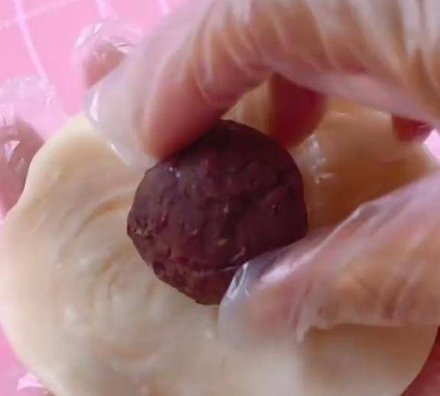 第18步、用手掌心按成薄薄的面片,把豆沙包進去。