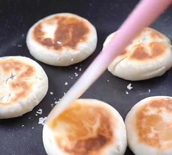 第20步、再次按扁一點,放入平底鍋裡面,不需要加油,小火慢慢煎,煎至雙面金黃色就可以瞭。