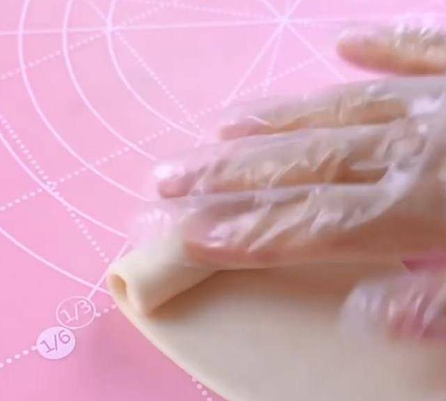 第16步、再次搟成長長的牛舌狀,由上至下卷起來。
